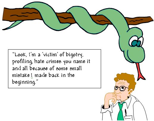 Our person replied, “O my, but aren’t you a Snake? I mean, you could seriously hurt me!” To which the old snake countered, “Look, I’m a ‘victim’ of bigotry, profiling, hate crimes you name it and all because of some small mistake I made back in the beginning.  But listen, the ACLU won my case, so now it’s a Hate crime to think of me like that!  Look, you can trust me and besides, I will be your FRIEND for Life!!”